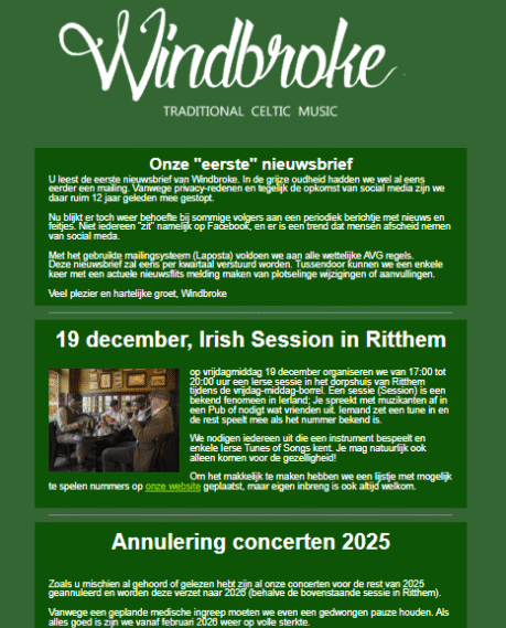 Op verzoek van een aantal volgers zijn we onlangs weer begonnen met een periodieke nieuwsbrief-mailing. Hoewel we alle informatie over de band en activiteiten delen via deze website en Facebook blijkt er toch ook behoefte aan een regelmatige update via de mail.
